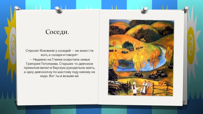 — Недавно на Глинке осиротела семья Григория Потопаева. Старших-то девчонок приказчик велел в барскую рукодельню взять, а одну девчоночку по шестому году никому не надо. Вот ты и возьми её.