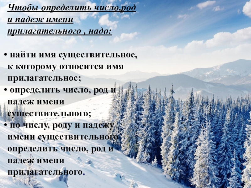 Чтобы определить число,род и падеж имени прилагательного , надо: найти имя существительное, к которому относится имя прилагательное;