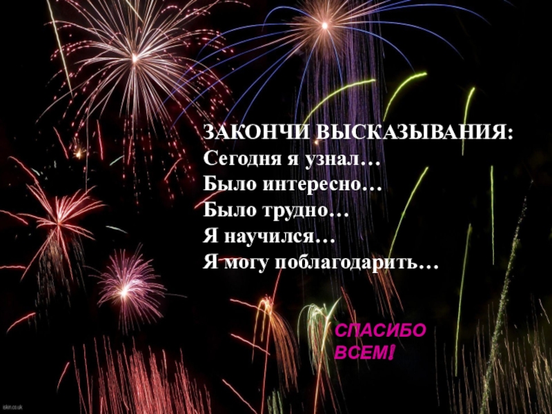 ЗАКОНЧИ ВЫСКАЗЫВАНИЯ:Сегодня я узнал…Было интересно…Было трудно…Я научился…Я могу поблагодарить…СПАСИБО ВСЕМ!