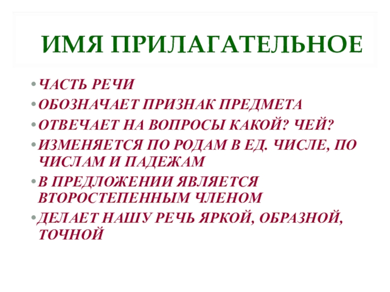 ИМЯ ПРИЛАГАТЕЛЬНОЕЧАСТЬ РЕЧИОБОЗНАЧАЕТ ПРИЗНАК ПРЕДМЕТАОТВЕЧАЕТ НА ВОПРОСЫ КАКОЙ? ЧЕЙ?ИЗМЕНЯЕТСЯ ПО РОДАМ В ЕД. ЧИСЛЕ, ПО