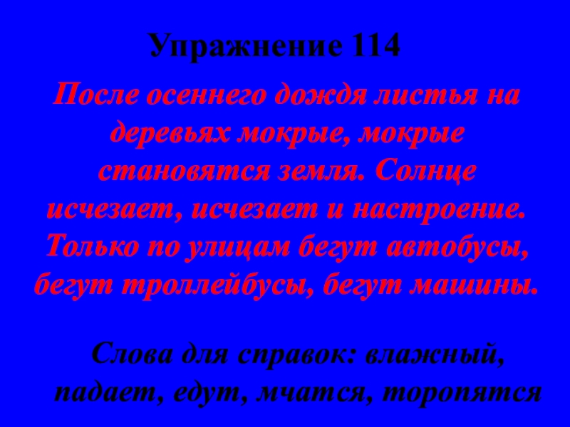 Слова для справок: влажный, падает, едут, мчатся, торопятся