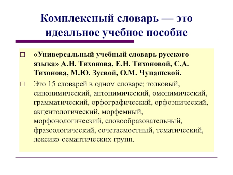 Это 15 словарей в одном словаре: толковый, синонимический, антонимический, омонимический, грамматический, орфографический, орфоэпический, акцентологический, морфемный, морфонологический, словообразовательный, фразеологический, сочетаемостный, тематический, лексико-семантических групп.