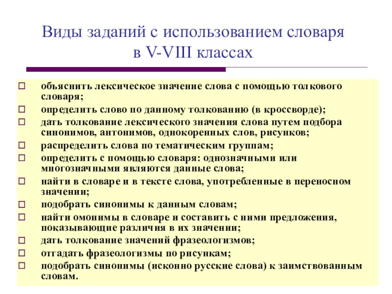 Слайд 10Виды заданий с использованием словаря в V-VIII классах
