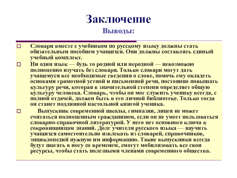 Выпускник современной школы, гимназии, лицея не может считаться полноценным гражданином, если он не умеет пользоваться словарно-справочной литературой. У него нет основного ключа к сокровищницам знаний. Долг учителя русского языка — научить учащихся самостоятельно извлекать из словарей, справочников, энциклопедий нужную им информацию. Такие выпускники всегда будут шагать в ногу со временем, смогут мобилизовать все свои ресурсы, чтобы стать полезными членами современного общества.
