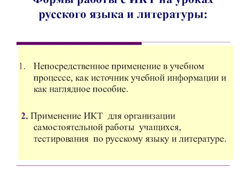 2. Применение ИКТ для организации самостоятельной работы учащихся, тестирования по русскому языку и литературе.