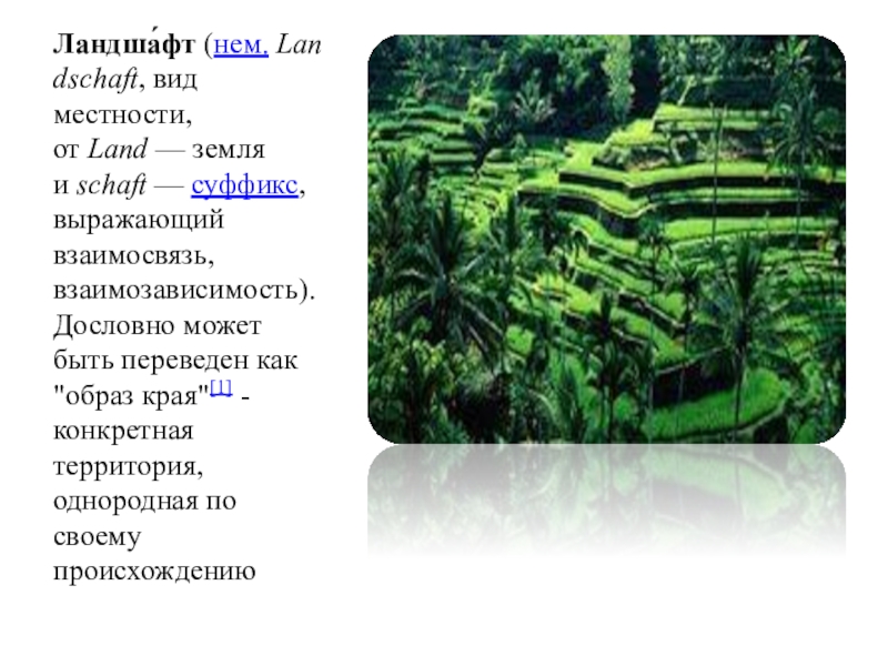 Слайд 5Ландша́фт (нем. Landschaft, вид местности, от Land — земля и schaft — суффикс, выражающий взаимосвязь, взаимозависимость). Дословно может