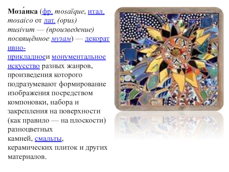 Слайд 4Моза́ика (фр. mosaïque, итал. mosaico от лат. (opus) musivum — (произведение) посвящённое музам) — декоративно-прикладноеи монументальное искусство разных жанров, произведения которого подразумевают формирование изображения посредством компоновки,
