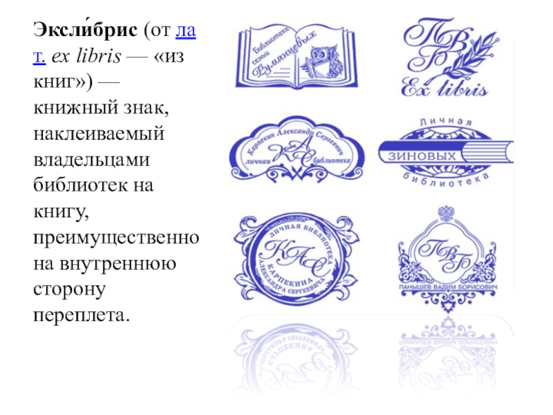 Слайд 3Эксли́брис (от лат. ex libris — «из книг») — книжный знак, наклеиваемый владельцами библиотек на книгу,