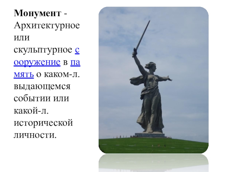 Слайд 2Монумент - Архитектурное или скульптурное сооружение в память о каком-л. выдающемся событии или какой-л. исторической