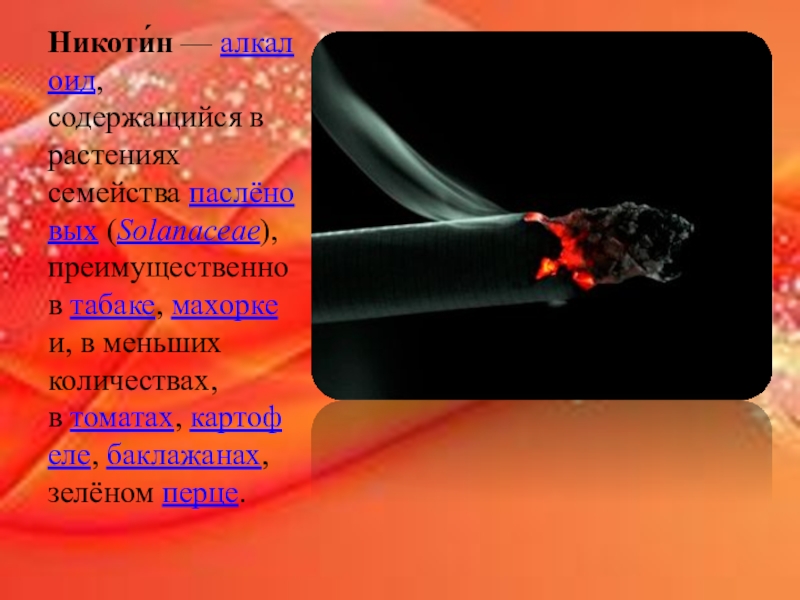 Слайд 2Никоти́н — алкалоид, содержащийся в растениях семейства паслёновых (Solanaceae), преимущественно в табаке, махорке и, в меньших количествах, в томатах, картофеле, баклажанах,