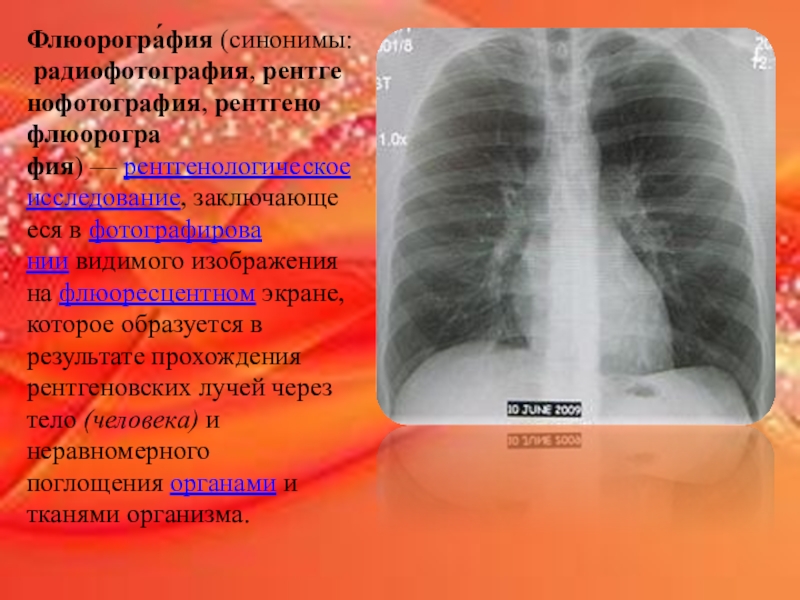 Слайд 6Флюорогра́фия (синонимы: радиофотография, рентгенофотография, рентгено­флюоро­гра­фия) — рентгенологическое исследование, заключа­ю­ще­е­ся в фото­графи­ро­ва­нии видимого изображения на флюоресцентном экране, которое образуется в результате прохождения