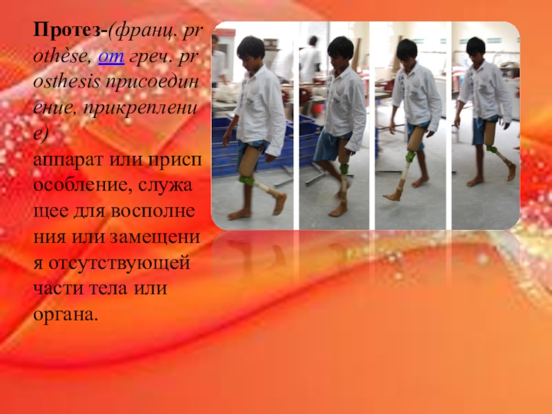 Слайд 4Протез-(франц. prothèse, от греч. prosthesis присоединение, прикрепление)аппарат или приспособление, служащее для восполнения или замещения отсутствующей части тела или органа.