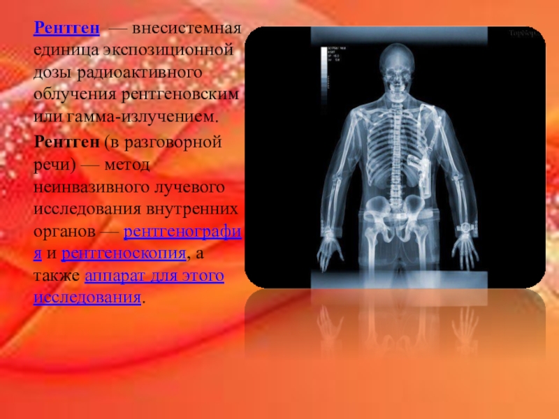 Слайд 5Рентген  — внесистемная единица экспозиционной дозы радиоактивного облучения рентгеновским или гамма-излучением.