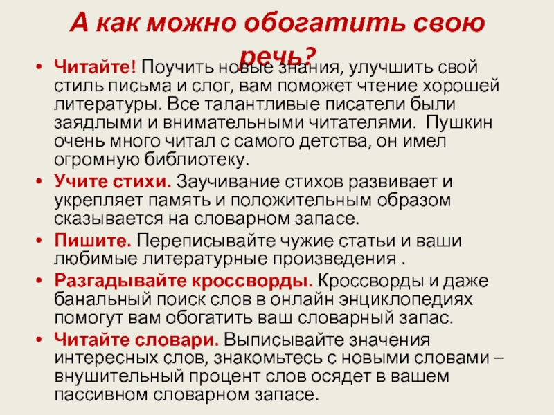письма и слог, вам поможет чтение хорошей литературы. Все талантливые писатели были заядлыми и внимательными читателями. Пушкин очень много читал с самого детства, он имел огромную библиотеку.