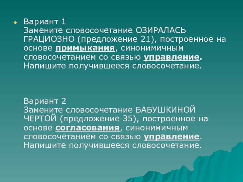 Слайд 7Вариант 1 Замените словосочетание ОЗИРАЛАСЬ ГРАЦИОЗНО (предложение 21), построенное на основе примыкания,