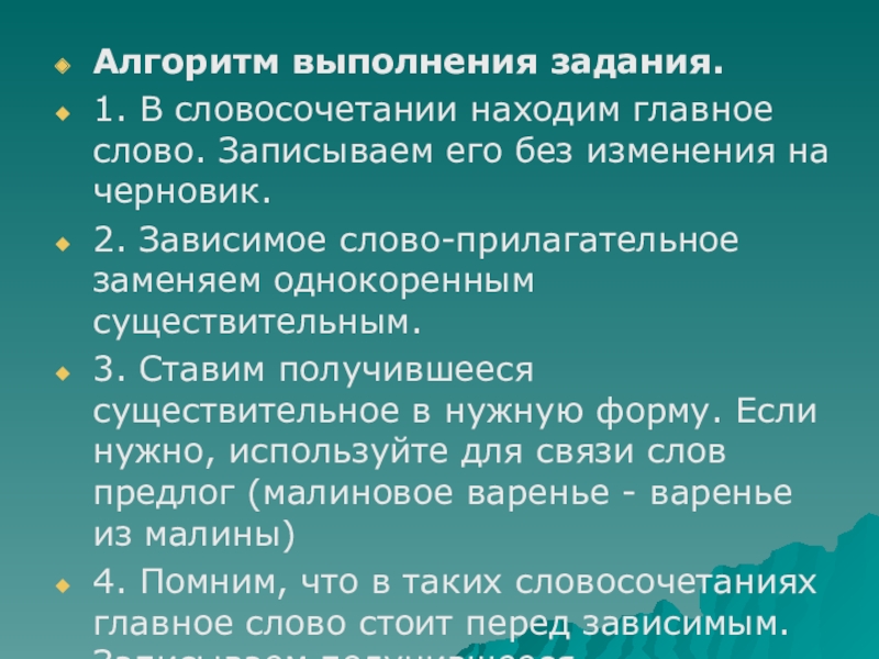 Алгоритм выполнения задания.1. В словосочетании находим главное слово. Записываем его без изменения на черновик.2. Зависимое слово-прилагательное заменяем однокоренным существительным.3. Ставим получившееся существительное в нужную форму. Если нужно, используйте для связи слов предлог (малиновое варенье - варенье