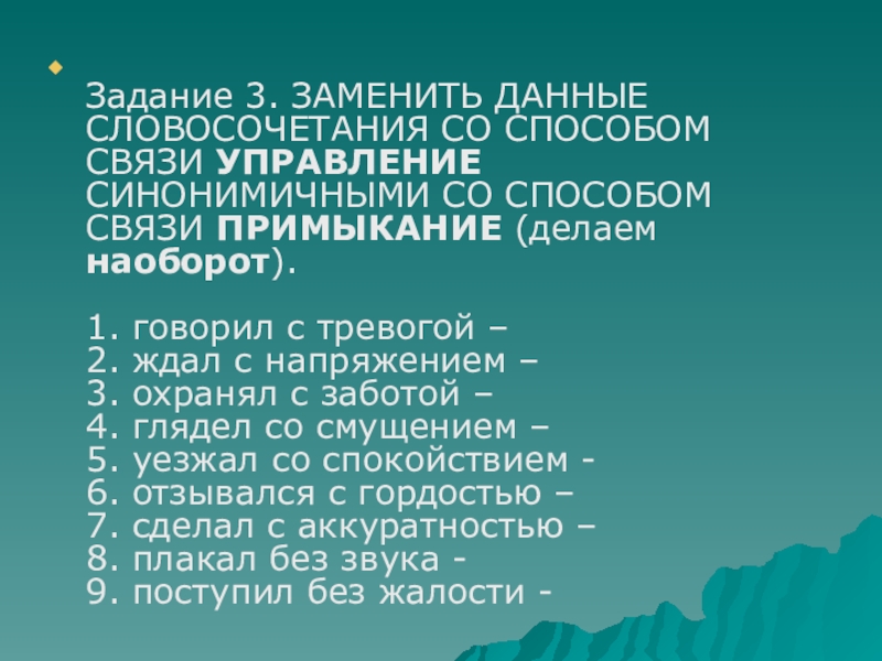 Слайд 8 Задание 3. ЗАМЕНИТЬ ДАННЫЕ СЛОВОСОЧЕТАНИЯ СО СПОСОБОМ СВЯЗИ УПРАВЛЕНИЕ СИНОНИМИЧНЫМИ СО
