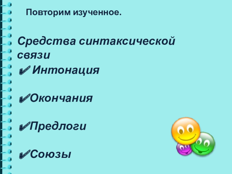 Средства синтаксической связиПовторим изученное. ИнтонацияОкончанияПредлогиСоюзы