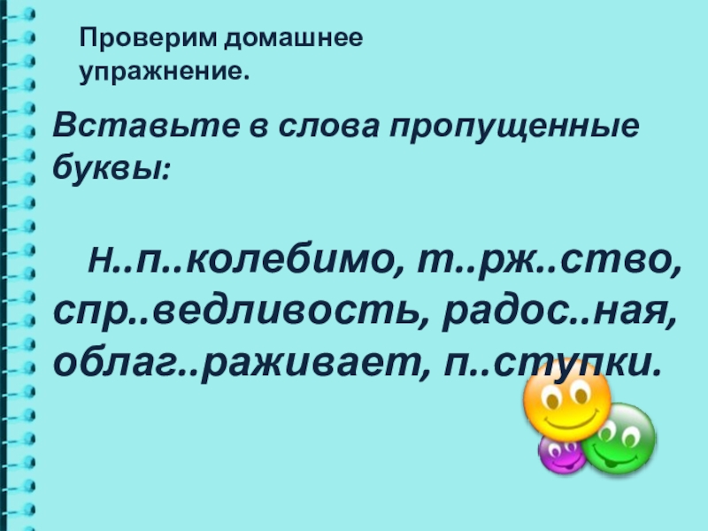 Вставьте в слова пропущенные буквы:	Н..п..колебимо, т..рж..ство, спр..ведливость, радос..ная, облаг..раживает, п..ступки.Проверим домашнее упражнение.