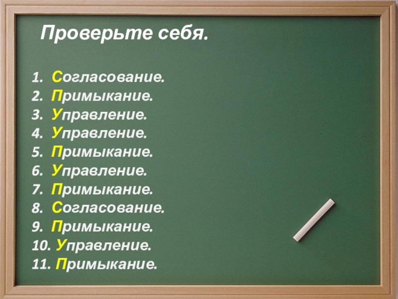 Проверьте себя.1. Согласование.2. Примыкание.3. Управление.4. Управление.5. Примыкание.6. Управление.7. Примыкание.8. Согласование.9. Примыкание.10. Управление.11. Примыкание.