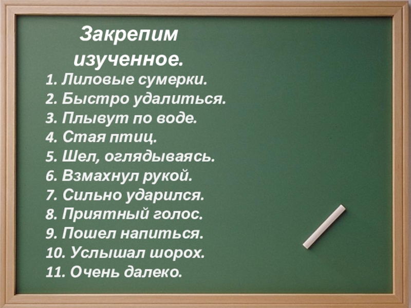 Закрепим изученное.1. Лиловые сумерки.2. Быстро удалиться.3. Плывут по воде.4. Стая птиц.5. Шел, оглядываясь.6. Взмахнул рукой.7. Сильно ударился.8.