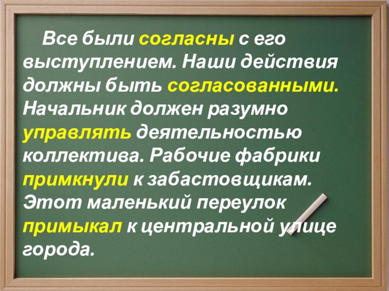 должны быть согласованными. Начальник должен разумно управлять деятельностью коллектива. Рабочие фабрики примкнули к забастовщикам. Этот маленький переулок примыкал к центральной улице города.