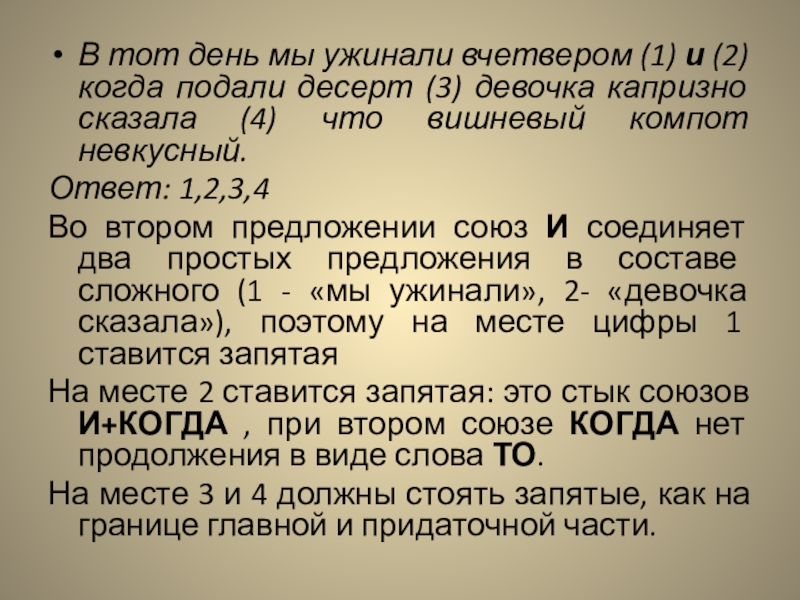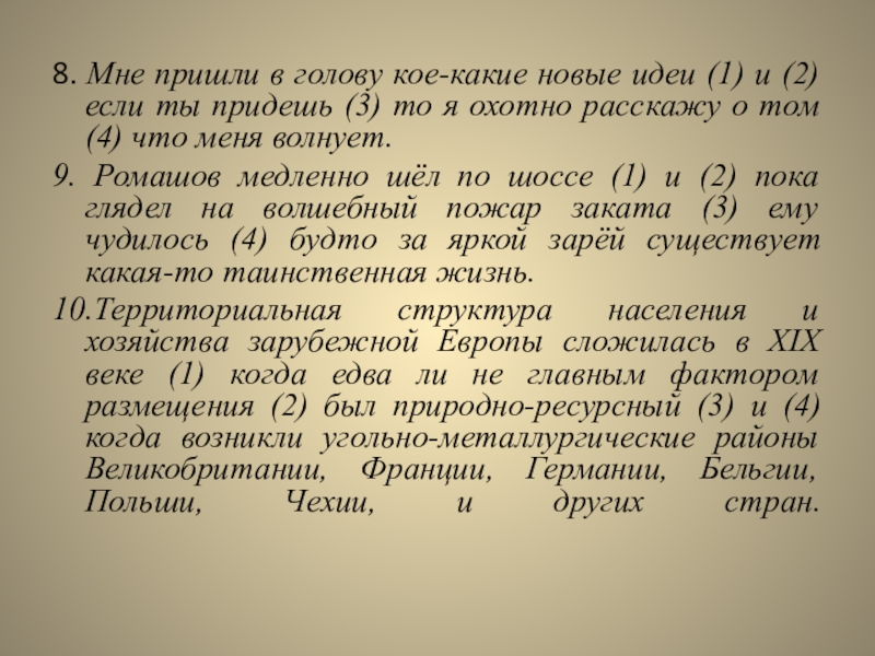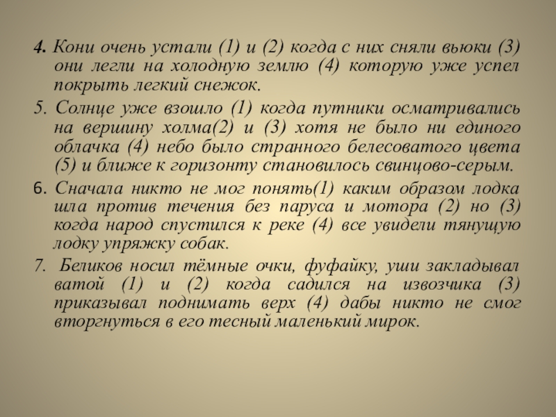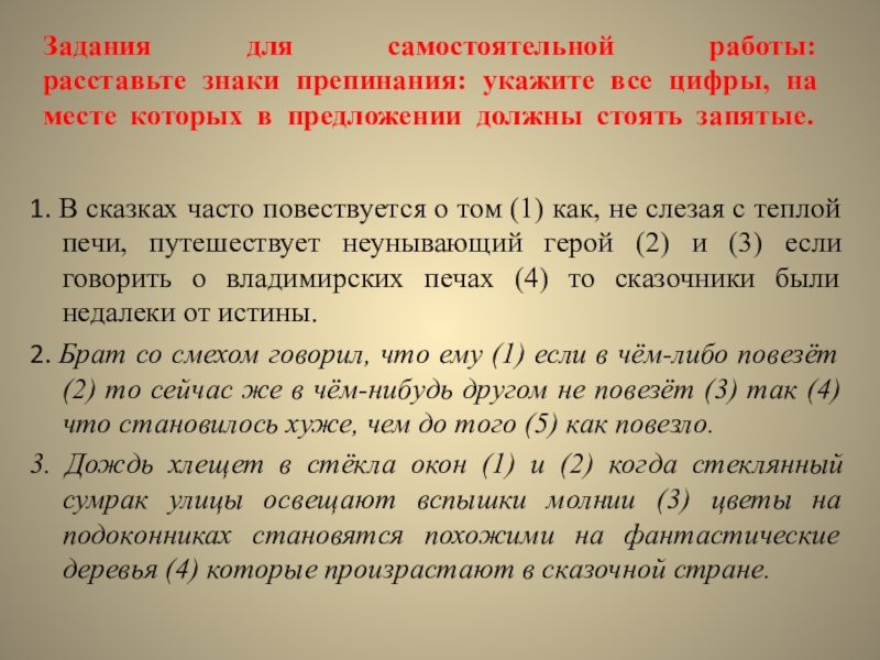1. В сказках часто повествуется о том (1) как, не слезая с теплой печи, путешествует неунывающий герой (2) и (3) если говорить о владимирских печах (4) то сказочники были недалеки от истины.