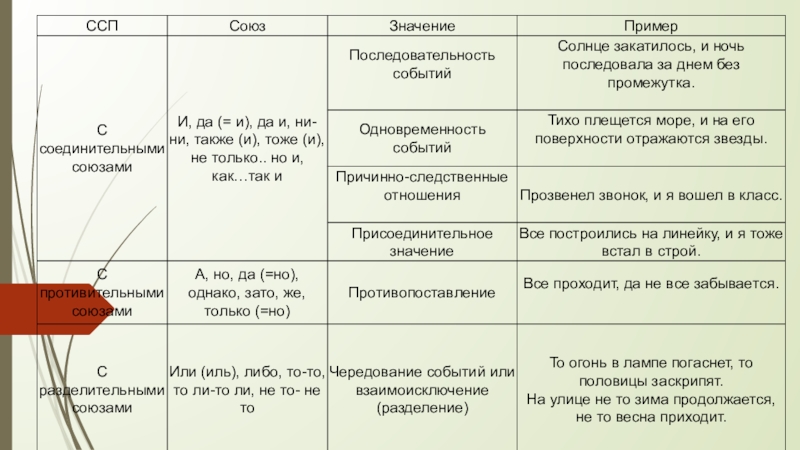Смысловые отношения простых предложений в сложносочиненном зависят от характера союзов.