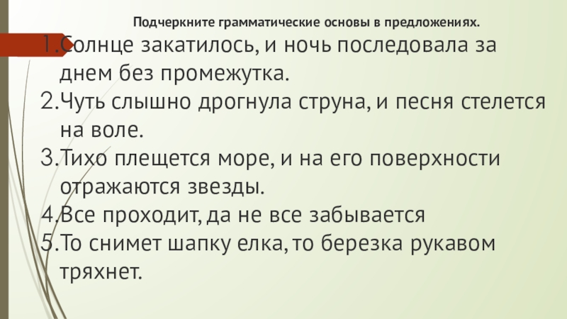 Слайд 5Подчеркните грамматические основы в предложениях.