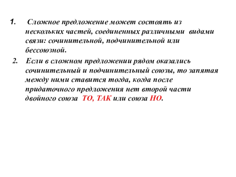 2. Если в сложном предложении рядом оказались сочинительный и подчинительный союзы, то запятая между ними ставится тогда, когда после придаточного предложения нет второй части двойного союза ТО, ТАК или союза НО.