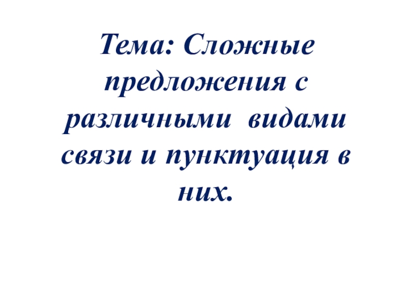 Слайд 1Тема: Сложные предложения с различными видами связи и пунктуация в них.