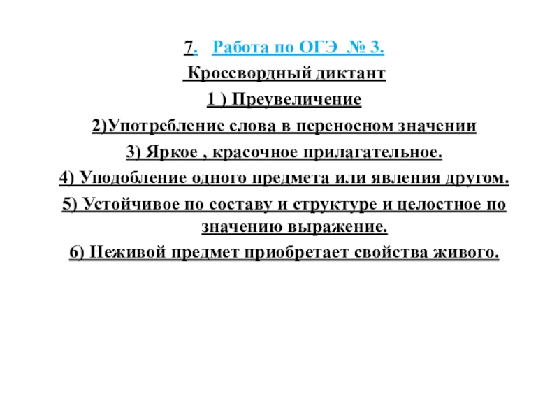7. 	Работа по ОГЭ № 3. Кроссвордный диктант1 ) Преувеличение 2)Употребление слова в переносном значении3) Яркое ,