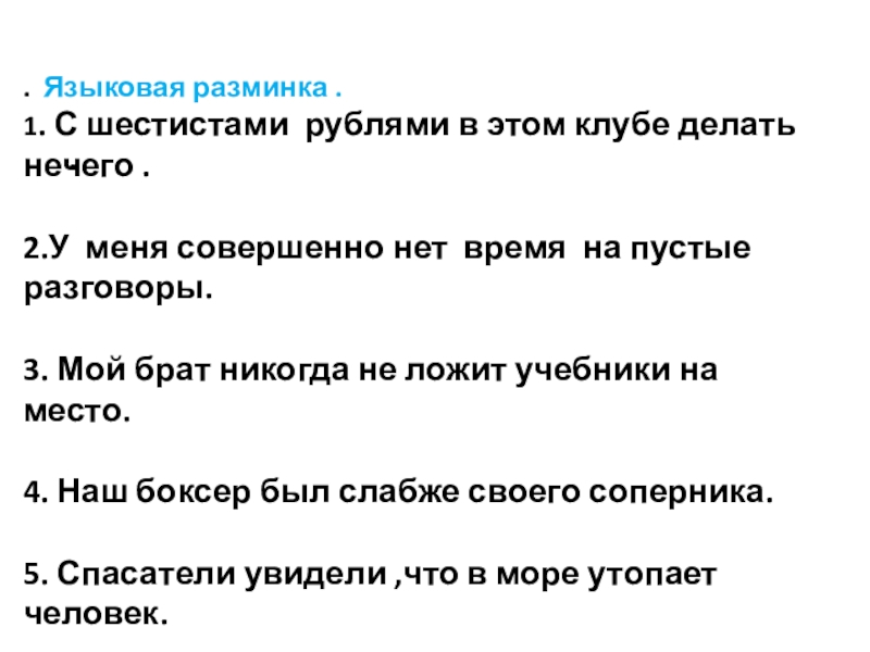 .. Языковая разминка .  1. С шестистами рублями в этом клубе делать нечего .2.У меня