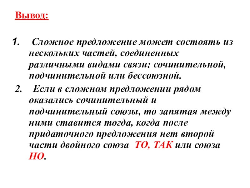 Вывод: Сложное предложение может состоять из нескольких частей, соединенных различными видами связи: сочинительной, подчинительной или бессоюзной.2.