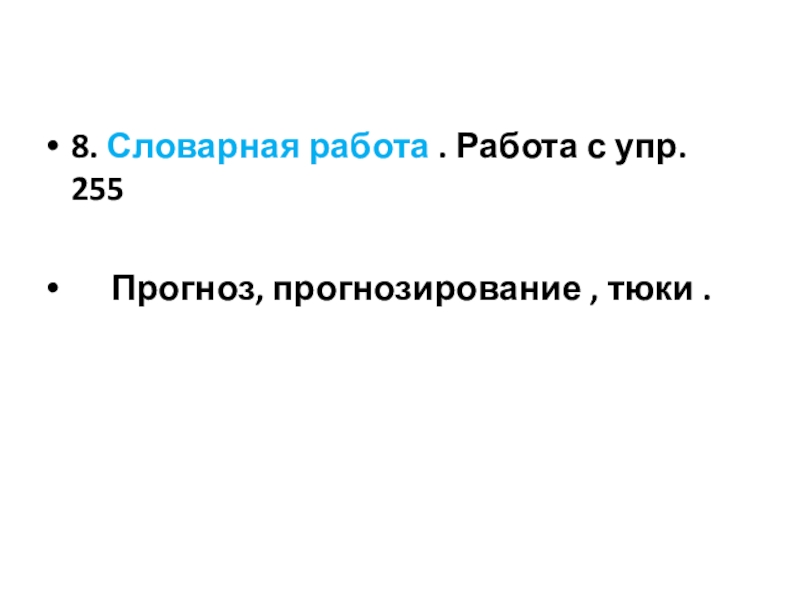 8. Словарная работа . Работа с упр. 255   Прогноз, прогнозирование , тюки .