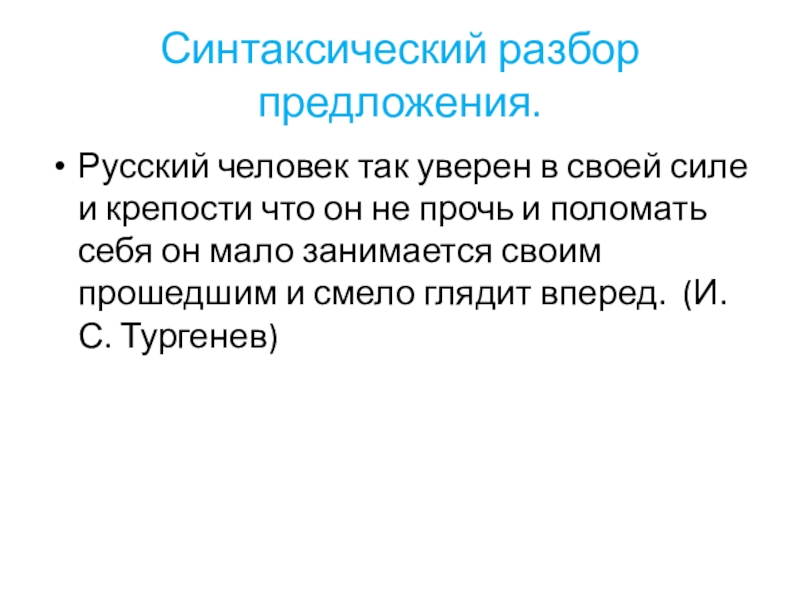 Синтаксический разбор предложения. Русский человек так уверен в своей силе и крепости что он не прочь и