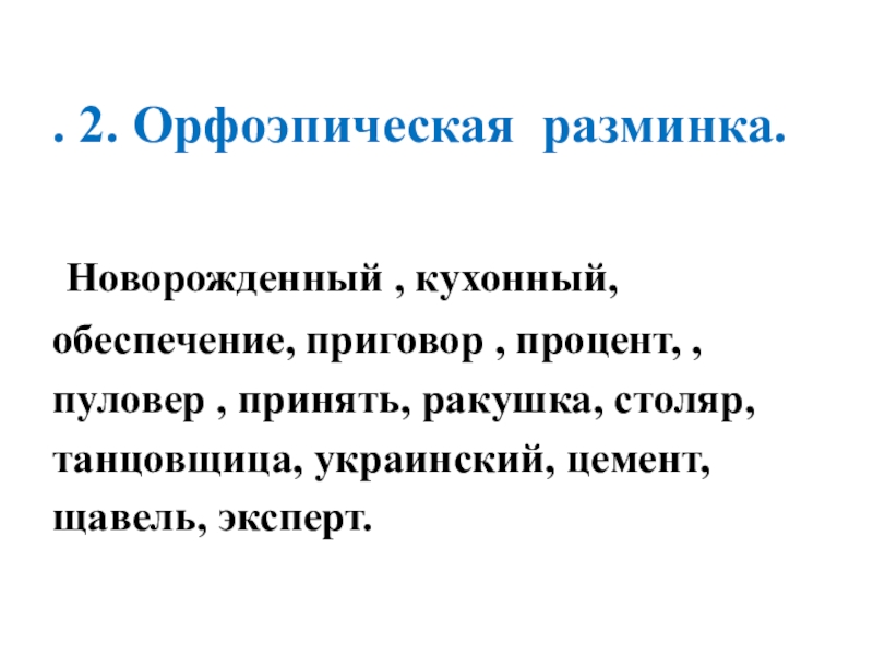 . 2. Орфоэпическая разминка.  Новорожденный , кухонный,обеспечение, приговор , процент, , пуловер , принять, ракушка, столяр,