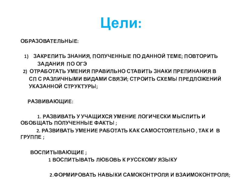 Цели: ОБРАЗОВАТЕЛЬНЫЕ: 1) ЗАКРЕПИТЬ ЗНАНИЯ, ПОЛУЧЕННЫЕ ПО ДАННОЙ ТЕМЕ; ПОВТОРИТЬ ЗАДАНИЯ ПО ОГЭ 2) ОТРАБОТАТЬ УМЕНИЯ ПРАВИЛЬНО СТАВИТЬ ЗНАКИ ПРЕПИНАНИЯ В