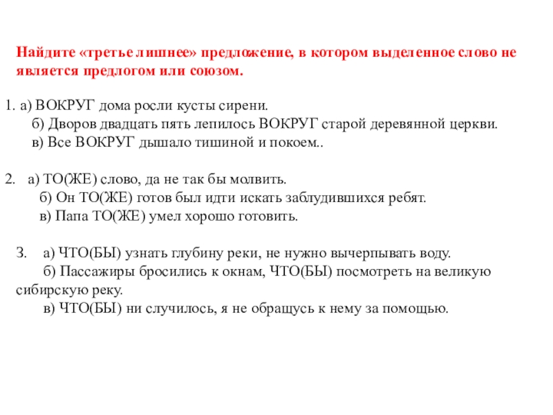 Слайд 24Найдите «третье лишнее» предложение, в котором выделенное слово не является предлогом