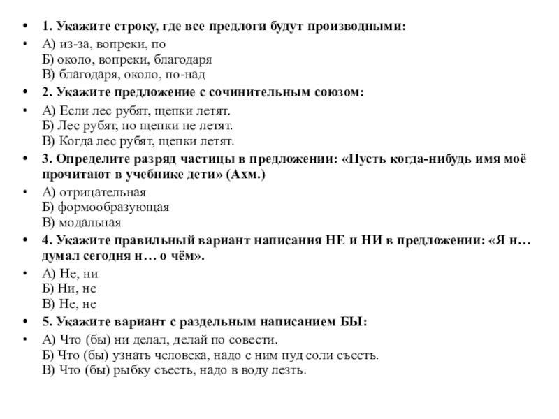 Слайд 181. Укажите строку, где все предлоги будут производными: