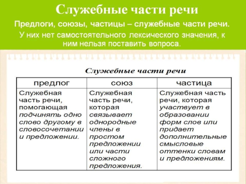 7. Служебные части речи нужны для обслуживания самостоятельных. Они связывают слова, словосочетания в предложения, а так же предложения между собой.