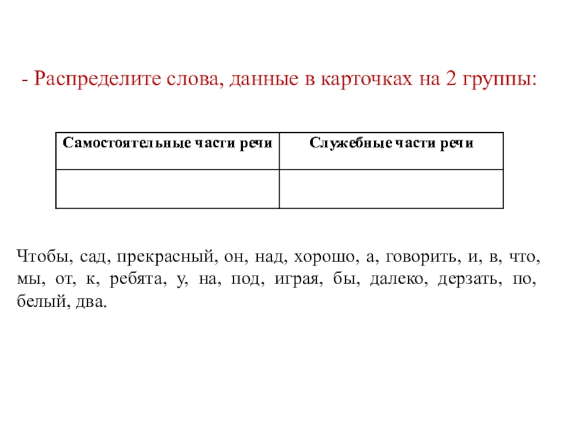 Слайд 13- Распределите слова, данные в карточках на 2 группы: