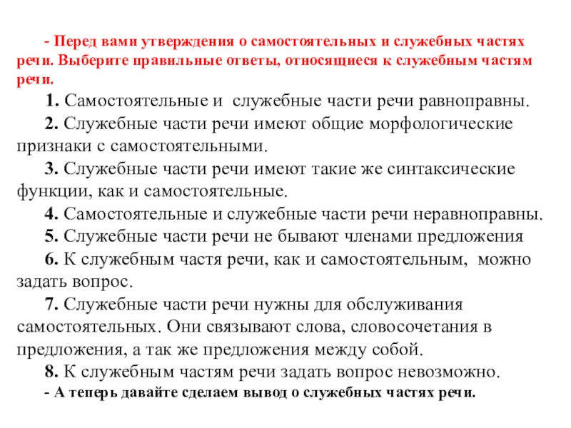 - А теперь давайте сделаем вывод о служебных частях речи.