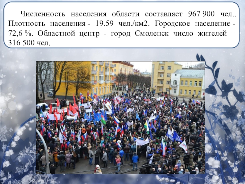 население - 72,6 %. Областной центр - город Смоленск число жителей – 316 500 чел.