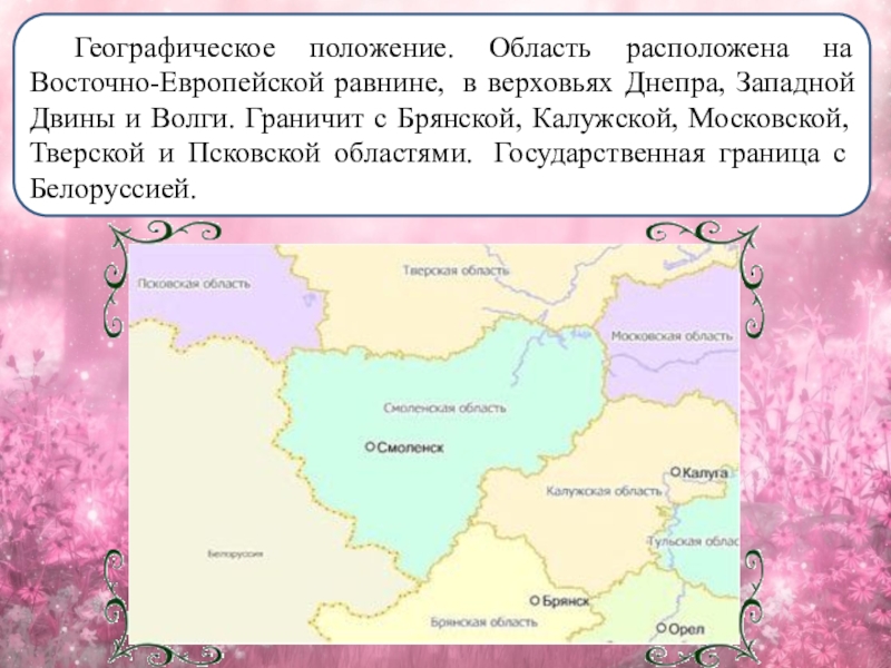 Географическое положение. Область расположена на Восточно-Европейской равнине,  в верховьях Днепра, Западной Двины и Волги. Граничит с Брянской,