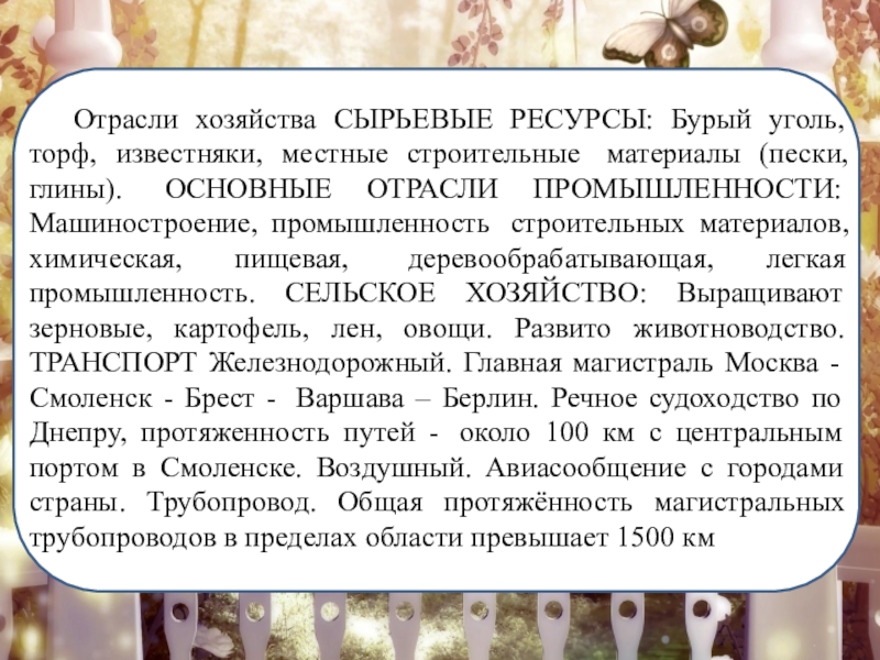 (пески, глины).  ОСНОВНЫЕ ОТРАСЛИ ПРОМЫШЛЕННОСТИ: Машиностроение, промышленность  строительных материалов, химическая, пищевая,  деревообрабатывающая, легкая промышленность. СЕЛЬСКОЕ ХОЗЯЙСТВО: Выращивают зерновые, картофель, лен, овощи. Развито животноводство. ТРАНСПОРТ Железнодорожный. Главная магистраль Москва - Смоленск - Брест -  Варшава – Берлин. Речное судоходство по Днепру, протяженность путей -  около 100 км с центральным портом в Смоленске. Воздушный. Авиасообщение с городами страны. Трубопровод. Общая протяжённость магистральных трубопроводов в пределах области превышает 1500 км