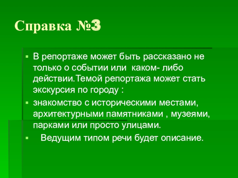 каком- либо действии.Темой репортажа может стать экскурсия по городу :