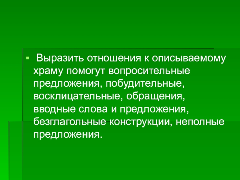 Выразить отношения к описываемому храму помогут вопросительные предложения, побудительные, восклицательные,