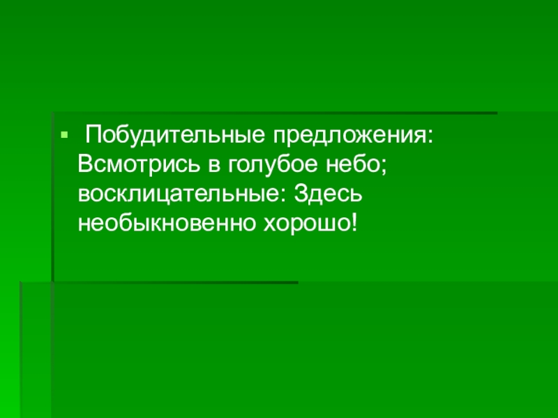 Побудительные предложения: Всмотрись в голубое небо; восклицательные: Здесь необыкновенно хорошо!