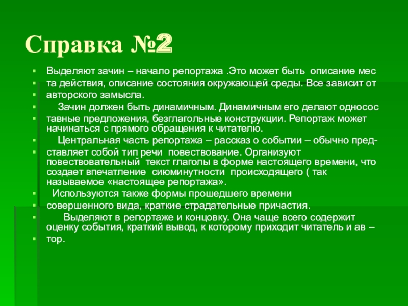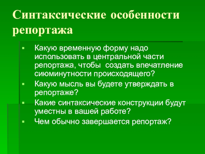 тавные предложения, безглагольные конструкции. Репортаж может начинаться с прямого обращения к читателю.